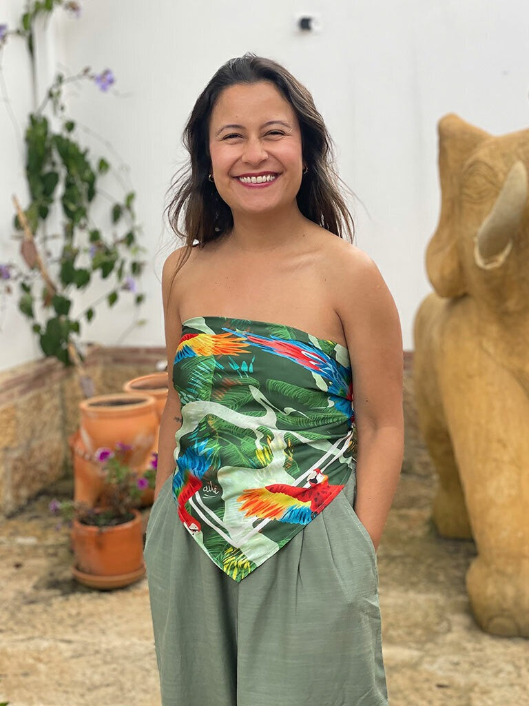 Pañoleta hecha 50% con botellas de plástico recicladas y 50% poliéster.